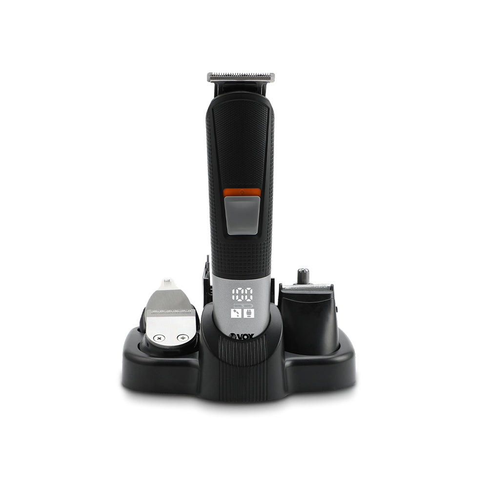 5 em 1: Faca em T, faca em U, máquina de barbear, aparador de nariz e orelhas, pentes para diferentes comprimentos, suporte, óleo e escova