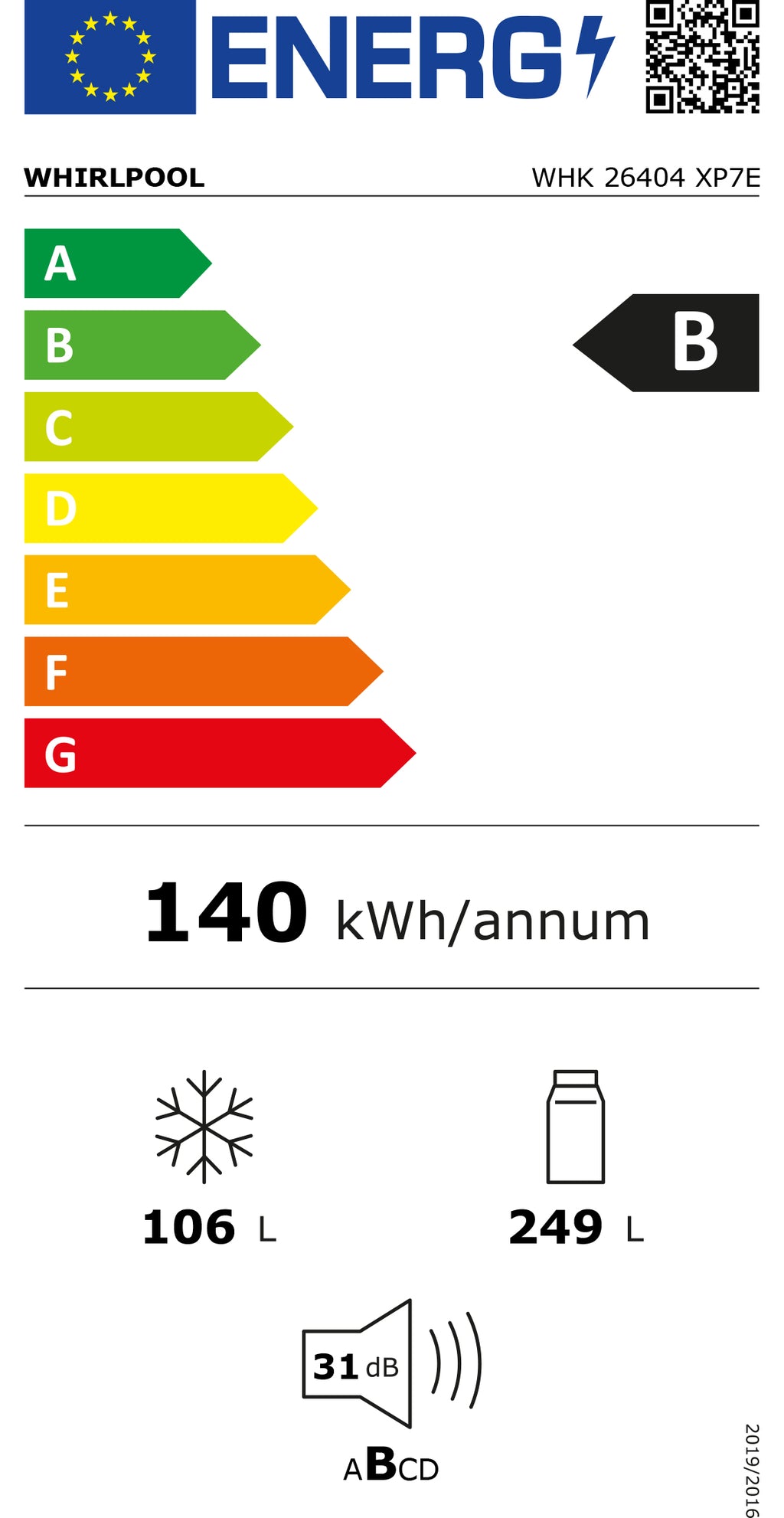 Líquida total: 355 L | Nível de ruído: 31 dB(A) - Classe B | Capacidade congelação 6Kg/24h